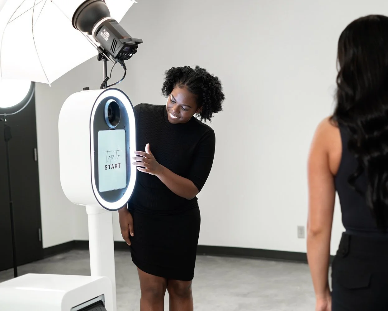 Freestanding Photo Booth - A digital photo booth equipped with a built-in, studio-grade camera and professional lighting. Easy to use and loaded with features!